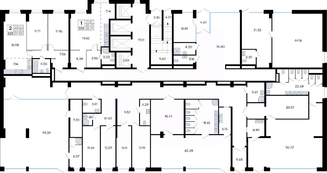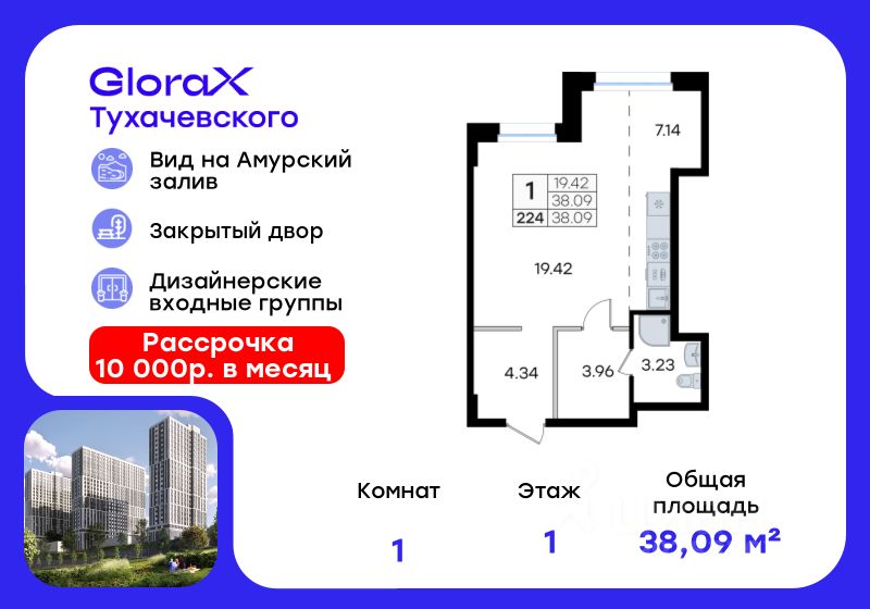 Продается квартира-студия на 1-м этаже в жилом комплексе GloraX Тухачевского — современном проекте нового формата в престижном районе Владивостока. Общая площадь лота составляет 38,09 кв. м, из которых 19,42 кв. м отведено под жилую и 7,14 кв. м под кухонную зону. Номер квартиры - 224.