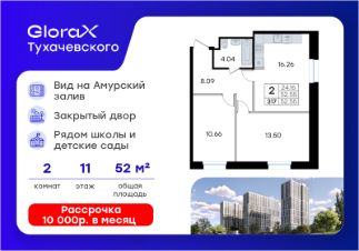 Продается 2-комн. квартира на 11-м этаже в жилом комплексе GloraX Тухачевского — современном проекте нового формата в престижном районе Владивостока. Общая площадь лота составляет 52,55 кв. м, из которых 24,16 кв. м отведено под жилую и 16,26 кв. м под кухонную зону. Номер квартиры - 317.