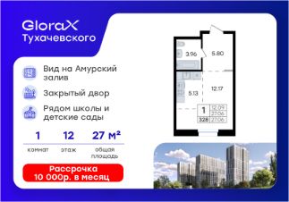 Продается квартира-студия на 12-м этаже в жилом комплексе GloraX Тухачевского — современном проекте нового формата в престижном районе Владивостока. Общая площадь лота составляет 27,06 кв. м, из которых 12,09 кв. м отведено под жилую и 5,13 кв. м под кухонную зону. Номер квартиры - 328.