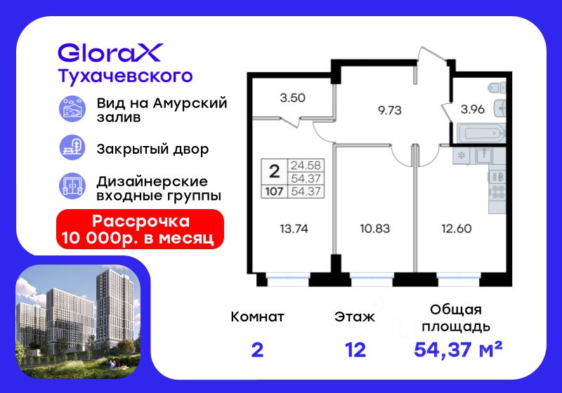 Продается 2-комн. квартира на 12-м этаже в жилом комплексе GloraX Тухачевского — современном проекте нового формата в престижном районе Владивостока. Общая площадь лота составляет 54,37 кв. м, из которых 24,58 кв. м отведено под жилую и 12,60 кв. м под кухонную зону. Номер квартиры - 107.