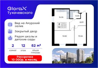 Продается 2-комн. квартира на 12-м этаже в жилом комплексе GloraX Тухачевского — современном проекте нового формата в престижном районе Владивостока. Общая площадь лота составляет 52,55 кв. м, из которых 24,16 кв. м отведено под жилую и 16,26 кв. м под кухонную зону. Номер квартиры - 110.