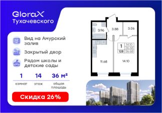 Продается 1-комн. квартира на 14-м этаже в жилом комплексе GloraX Тухачевского — современном проекте нового формата в престижном районе Владивостока. Общая площадь лота составляет 36,68 кв. м, из которых 14,10 кв. м отведено под жилую и 11,68 кв. м под кухонную зону. Номер квартиры - 128.