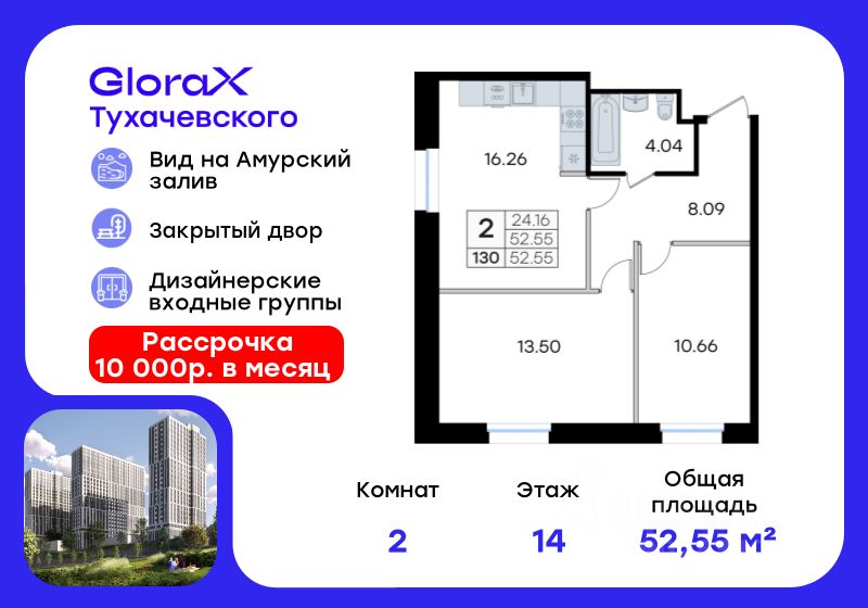 Продается 2-комн. квартира на 14-м этаже в жилом комплексе GloraX Тухачевского — современном проекте нового формата в престижном районе Владивостока. Общая площадь лота составляет 52,55 кв. м, из которых 24,16 кв. м отведено под жилую и 16,26 кв. м под кухонную зону. Номер квартиры - 130.