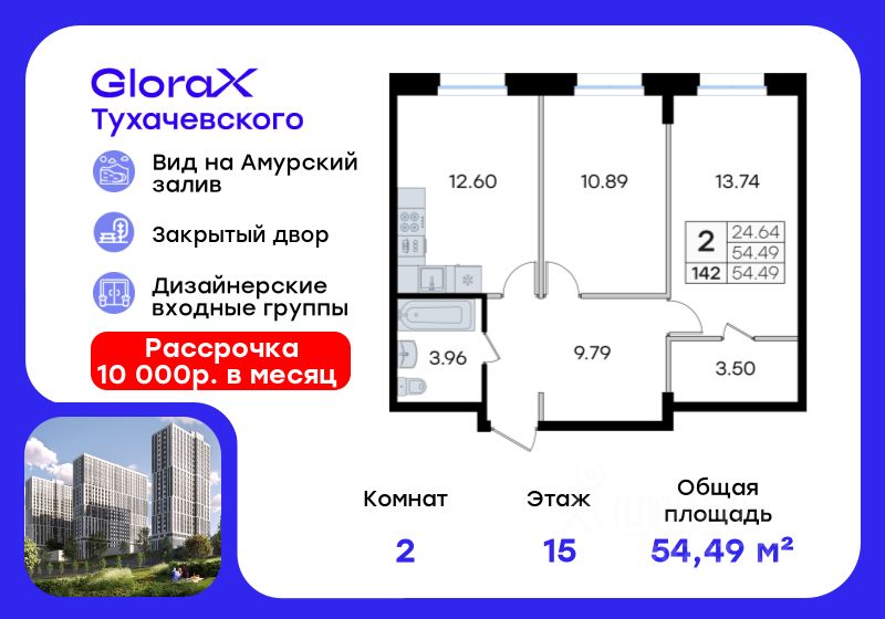 Продается 2-комн. квартира на 15-м этаже в жилом комплексе GloraX Тухачевского — современном проекте нового формата в престижном районе Владивостока. Общая площадь лота составляет 54,49 кв. м, из которых 24,64 кв. м отведено под жилую и 12,60 кв. м под кухонную зону. Номер квартиры - 142.