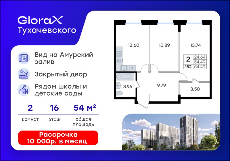Продается 2-комн. квартира на 16-м этаже в жилом комплексе GloraX Тухачевского — современном проекте нового формата в престижном районе Владивостока. Общая площадь лота составляет 54,49 кв. м, из которых 24,64 кв. м отведено под жилую и 12,60 кв. м под кухонную зону. Номер квартиры - 152.