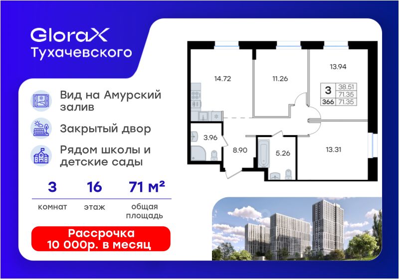 Продается 3-комн. квартира на 16-м этаже в жилом комплексе GloraX Тухачевского — современном проекте нового формата в престижном районе Владивостока. Общая площадь лота составляет 71,35 кв. м, из которых 38,51 кв. м отведено под жилую и 14,72 кв. м под кухонную зону. Номер квартиры - 366.