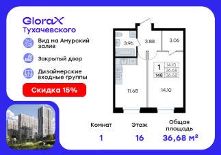Продается 1-комн. квартира на 16-м этаже в жилом комплексе GloraX Тухачевского — современном проекте нового формата в престижном районе Владивостока. Общая площадь лота составляет 36,68 кв. м, из которых 14,10 кв. м отведено под жилую и 11,68 кв. м под кухонную зону. Номер квартиры - 148.