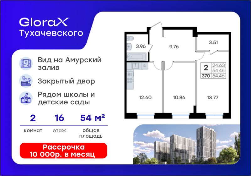 Продается 2-комн. квартира на 16-м этаже в жилом комплексе GloraX Тухачевского — современном проекте нового формата в престижном районе Владивостока. Общая площадь лота составляет 54,46 кв. м, из которых 24,63 кв. м отведено под жилую и 12,60 кв. м под кухонную зону. Номер квартиры - 370.