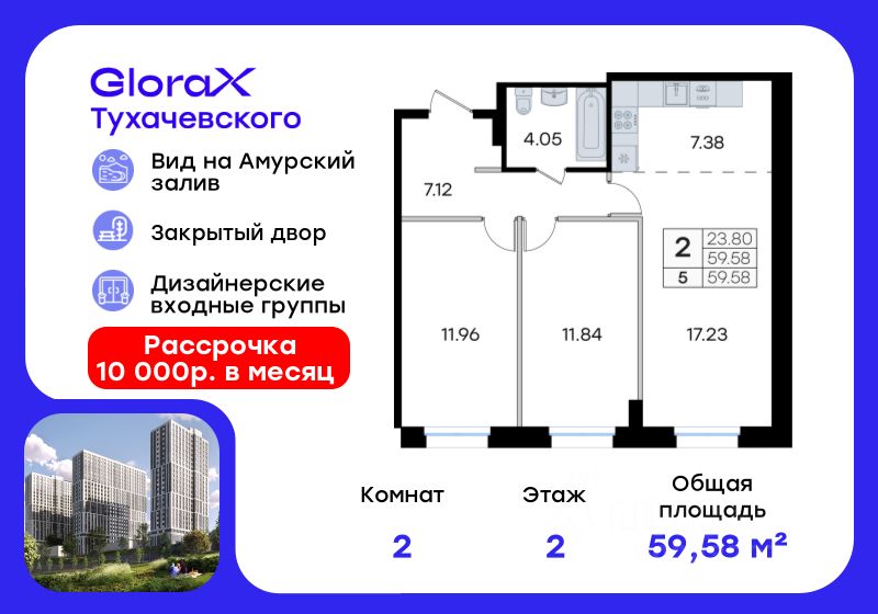 Продается 2-комн. квартира  на 2-м этаже в жилом комплексе GloraX Тухачевского — современном проекте нового формата в престижном районе Владивостока. Общая площадь лота составляет 59,58 кв. м, из которых 23,80 кв. м отведено под жилую и 7,38 кв. м под кухонную зону. Номер квартиры - 5.