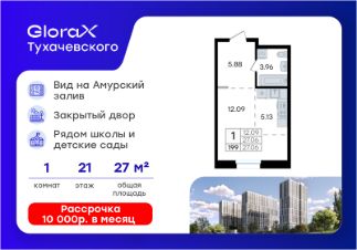 Продается квартира-студия на 21-м этаже в жилом комплексе GloraX Тухачевского — современном проекте нового формата в престижном районе Владивостока. Общая площадь лота составляет 27,06 кв. м, из которых 12,09 кв. м отведено под жилую и 5,13 кв. м под кухонную зону. Номер квартиры - 199.