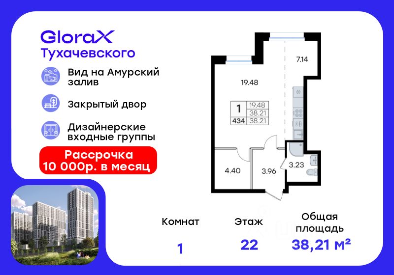 Продается квартира-студия на 22-м этаже в жилом комплексе GloraX Тухачевского — современном проекте нового формата в престижном районе Владивостока. Общая площадь лота составляет 38,21 кв. м, из которых 19,48 кв. м отведено под жилую и 7,14 кв. м под кухонную зону. Номер квартиры - 434.