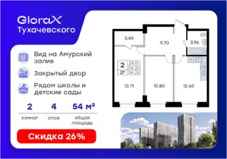 Продается 2-комн. квартира на 4-м этаже в жилом комплексе GloraX Тухачевского — современном проекте нового формата в престижном районе Владивостока. Общая площадь лота составляет 54,26 кв. м, из которых 24,51 кв. м отведено под жилую и 12,60 кв. м под кухонную зону. Номер квартиры - 27.