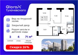 Продается 3-комн. квартира на 4-м этаже в жилом комплексе GloraX Тухачевского — современном проекте нового формата в престижном районе Владивостока. Общая площадь лота составляет 71,12 кв. м, из которых 38,45 кв. м отведено под жилую и 14,66 кв. м под кухонную зону. Номер квартиры - 31.