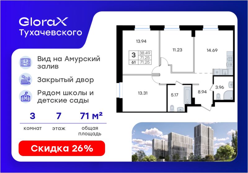 Продается 3-комн. квартира на 7-м этаже в жилом комплексе GloraX Тухачевского — современном проекте нового формата в престижном районе Владивостока. Общая площадь лота составляет 71,25 кв. м, из которых 38,49 кв. м отведено под жилую и 14,69 кв. м под кухонную зону. Номер квартиры - 61.