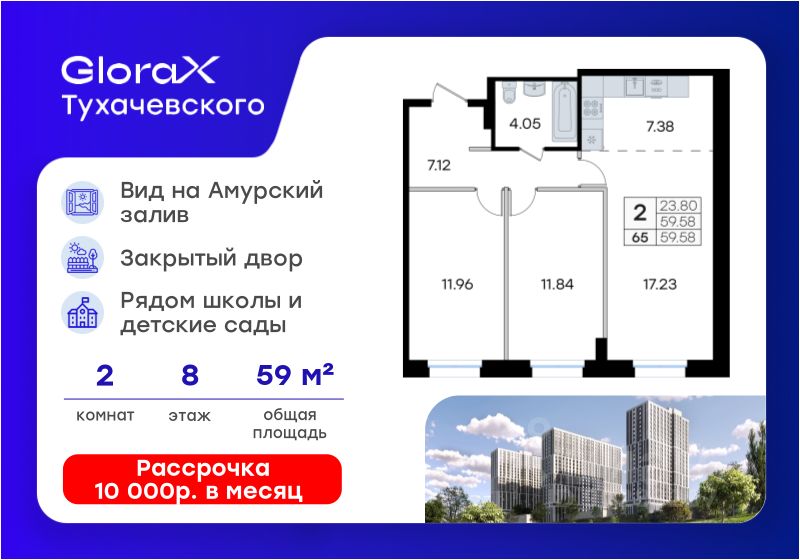 Продается 2-комн. квартира на 8-м этаже в жилом комплексе GloraX Тухачевского — современном проекте нового формата в престижном районе Владивостока. Общая площадь лота составляет 59,58 кв. м, из которых 23,80 кв. м отведено под жилую и 7,38 кв. м под кухонную зону. Номер квартиры - 65.