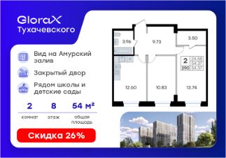 Продается 2-комн. квартира на 8-м этаже в жилом комплексе GloraX Тухачевского — современном проекте нового формата в престижном районе Владивостока. Общая площадь лота составляет 54,37 кв. м, из которых 24,58 кв. м отведено под жилую и 12,60 кв. м под кухонную зону. Номер квартиры - 290.