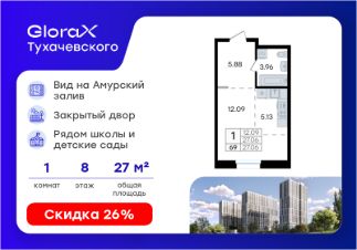 Продается квартира-студия на 8-м этаже в жилом комплексе GloraX Тухачевского — современном проекте нового формата в престижном районе Владивостока. Общая площадь лота составляет 27,06 кв. м, из которых 12,09 кв. м отведено под жилую и 5,13 кв. м под кухонную зону. Номер квартиры - 69.