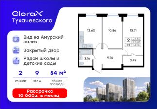 Продается 2-комн. квартира на 9-м этаже в жилом комплексе GloraX Тухачевского — современном проекте нового формата в престижном районе Владивостока. Общая площадь лота составляет 54,38 кв. м, из которых 24,57 кв. м отведено под жилую и 12,60 кв. м под кухонную зону. Номер квартиры - 82.