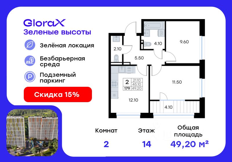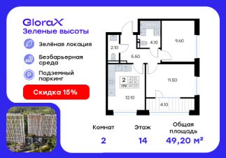 Продается 2-комн. квартира на 14-м этаже в жилом квартале GloraX Зелёные высоты — проекте в тихой зелёной локации. Общая площадь квартиры 49,20 кв. м, из которых 21,10 кв. м включая 21,10 кв. м жилого пространства и 12,10 кв. м кухни. Номер квартиры - 179.