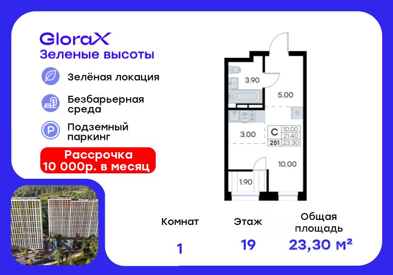Продается квартира-студия на 19-м этаже в жилом квартале GloraX Зелёные высоты — проекте в тихой зелёной локации. Общая площадь квартиры 23,30 кв. м, из которых 10,00 кв. м включая 10,00 кв. м жилого пространства и 3,00 кв. м кухни. Номер квартиры - 251.