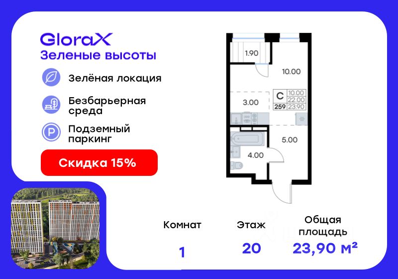 Продается квартира-студия на 20-м этаже в жилом квартале GloraX Зелёные высоты — проекте в тихой зелёной локации. Общая площадь квартиры 23,90 кв. м, из которых 10,00 кв. м включая 10,00 кв. м жилого пространства и 3,00 кв. м кухни. Номер квартиры - 259.
