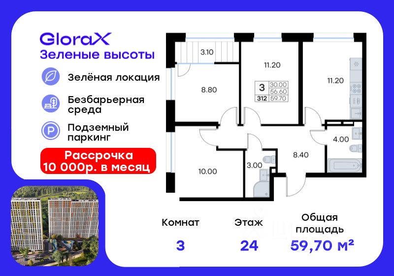 Продается 3-комн. квартира  на 24-м этаже в жилом квартале GloraX Зелёные высоты — проекте в тихой зелёной локации.  Общая площадь квартиры 59,70 кв. м, из которых 30,00 кв. м включая 30,00 кв. м жилого пространства и 11,20 кв. м кухни. Номер квартиры - 312.