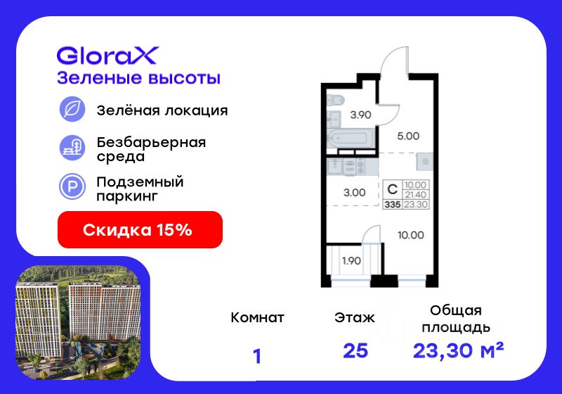 Продается квартира-студия на 25-м этаже в жилом квартале GloraX Зелёные высоты — проекте в тихой зелёной локации. Общая площадь квартиры 23,30 кв. м, из которых 10,00 кв. м включая 10,00 кв. м жилого пространства и 3,00 кв. м кухни. Номер квартиры - 335.