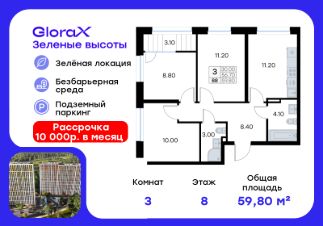 Продается 3-комн. квартира  на 8-м этаже в жилом квартале GloraX Зелёные высоты — проекте в тихой зелёной локации.  Общая площадь квартиры 59,80 кв. м, из которых 30,00 кв. м включая 30,00 кв. м жилого пространства и 11,20 кв. м кухни. Номер квартиры - 88.