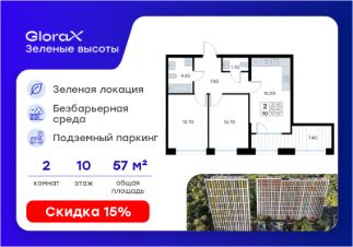 Продается 2-комн. квартира на 10-м этаже в жилом квартале GloraX Зелёные высоты — проекте в тихой зелёной локации. Общая площадь квартиры 57,80 кв. м, из которых 21,40 кв. м включая 21,40 кв. м жилого пространства и 15,00 кв. м кухни. Номер квартиры - 90.