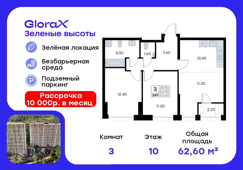 Продается 3-комн. квартира  на 10-м этаже в жилом квартале GloraX Зелёные высоты — проекте в тихой зелёной локации.  Общая площадь квартиры 62,60 кв. м, из которых 34,90 кв. м включая 34,90 кв. м жилого пространства и 10,40 кв. м кухни. Номер квартиры - 349.