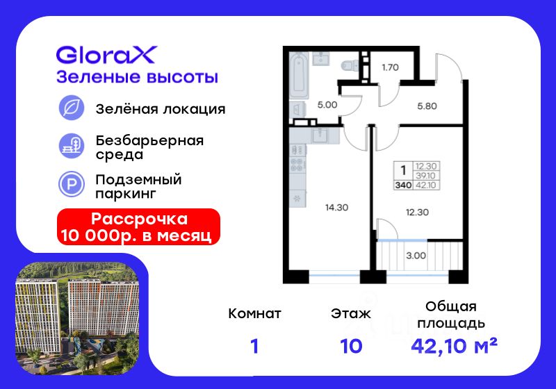 Продается 1-комн. квартира на 10-м этаже в жилом квартале GloraX Зелёные высоты — проекте в тихой зелёной локации. Общая площадь квартиры 42,10 кв. м, из которых 12,30 кв. м включая 12,30 кв. м жилого пространства и 14,30 кв. м кухни. Номер квартиры - 340.