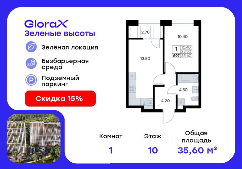 Продается 1-комн. квартира на 10-м этаже в жилом квартале GloraX Зелёные высоты — проекте в тихой зелёной локации. Общая площадь квартиры 35,60 кв. м, из которых 10,40 кв. м включая 10,40 кв. м жилого пространства и 13,80 кв. м кухни. Номер квартиры - 597.