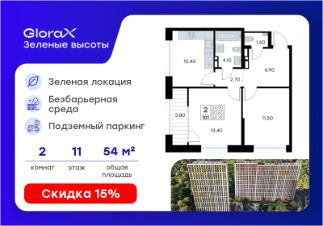 Продается 2-комн. квартира на 11-м этаже в жилом квартале GloraX Зелёные высоты — проекте в тихой зелёной локации. Общая площадь квартиры 54,30 кв. м, из которых 24,90 кв. м включая 24,90 кв. м жилого пространства и 10,40 кв. м кухни. Номер квартиры - 101.