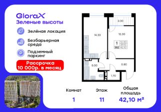 Продается 1-комн. квартира на 11-м этаже в жилом квартале GloraX Зелёные высоты — проекте в тихой зелёной локации. Общая площадь квартиры 42,10 кв. м, из которых 12,30 кв. м включая 12,30 кв. м жилого пространства и 14,30 кв. м кухни. Номер квартиры - 352.