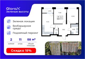 Продается 2-комн. квартира на 11-м этаже в жилом квартале GloraX Зелёные высоты — проекте в тихой зелёной локации. Общая площадь квартиры 58,00 кв. м, из которых 22,70 кв. м включая 22,70 кв. м жилого пространства и 16,10 кв. м кухни. Номер квартиры - 355.