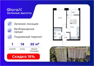 Продается 1-комн. квартира на 14-м этаже в жилом квартале GloraX Зелёные высоты — проекте в тихой зелёной локации. Общая площадь квартиры 35,10 кв. м, из которых 10,70 кв. м включая 10,70 кв. м жилого пространства и 13,60 кв. м кухни. Номер квартиры - 133.
