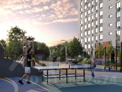 Территория жилого квартала благоустроена и включает игровые зоны и спортивные площадки для детей различных возрастных групп, уютные зоны отдыха со скамейками и универсальную воркаут-площадку для активного досуга.