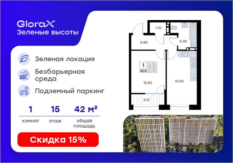 Продается 1-комн. квартира на 15-м этаже в жилом квартале GloraX Зелёные высоты — проекте в тихой зелёной локации. Общая площадь квартиры 42,40 кв. м, из которых 12,50 кв. м включая 12,50 кв. м жилого пространства и 14,00 кв. м кухни. Номер квартиры - 403.
