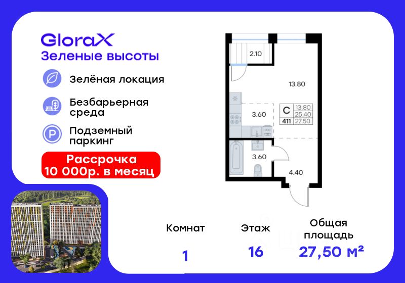 Продается квартира-студия на 16-м этаже в жилом квартале GloraX Зелёные высоты — проекте в тихой зелёной локации. Общая площадь квартиры 27,50 кв. м, из которых 13,80 кв. м включая 13,80 кв. м жилого пространства и 3,60 кв. м кухни. Номер квартиры - 411.