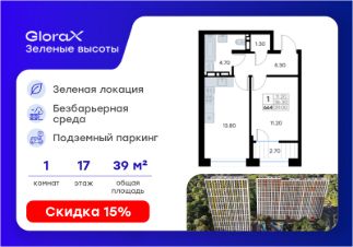 Продается 1-комн. квартира на 17-м этаже в жилом квартале GloraX Зелёные высоты — проекте в тихой зелёной локации. Общая площадь квартиры 39,00 кв. м, из которых 11,20 кв. м включая 11,20 кв. м жилого пространства и 13,80 кв. м кухни. Номер квартиры - 664.