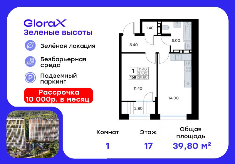 Продается 1-комн. квартира  на 17-м этаже в жилом квартале GloraX Зелёные высоты — проекте в тихой зелёной локации.  Общая площадь квартиры 39,80 кв. м, из которых 11,40 кв. м включая 11,40 кв. м жилого пространства и 14,00 кв. м кухни. Номер квартиры - 168.