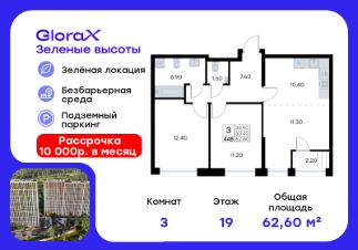 Продается 3-комн. квартира  на 19-м этаже в жилом квартале GloraX Зелёные высоты — проекте в тихой зелёной локации.  Общая площадь квартиры 62,60 кв. м, из которых 34,90 кв. м включая 34,90 кв. м жилого пространства и 10,40 кв. м кухни. Номер квартиры - 448.