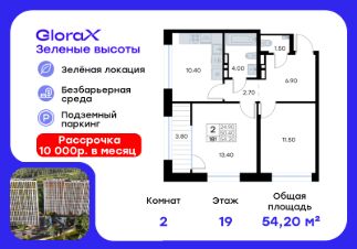 Продается 2-комн. квартира  на 19-м этаже в жилом квартале GloraX Зелёные высоты — проекте в тихой зелёной локации.  Общая площадь квартиры 54,20 кв. м, из которых 24,90 кв. м включая 24,90 кв. м жилого пространства и 10,40 кв. м кухни. Номер квартиры - 181.