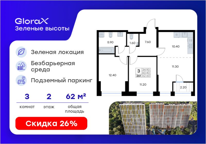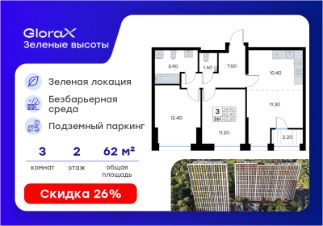 Продается 3-комн. квартира на 2-м этаже в жилом квартале GloraX Зелёные высоты — проекте в тихой зелёной локации. Общая площадь квартиры 62,60 кв. м, из которых 34,90 кв. м включая 34,90 кв. м жилого пространства и 10,40 кв. м кухни. Номер квартиры - 261.