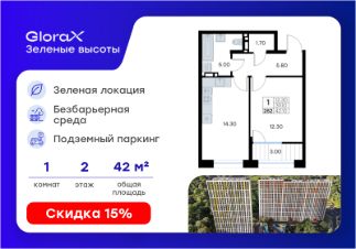 Продается 1-комн. квартира на 2-м этаже в жилом квартале GloraX Зелёные высоты — проекте в тихой зелёной локации. Общая площадь квартиры 42,10 кв. м, из которых 12,30 кв. м включая 12,30 кв. м жилого пространства и 14,30 кв. м кухни. Номер квартиры - 252.