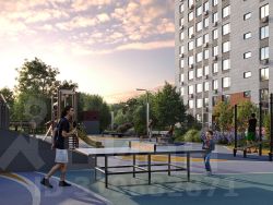 Территория жилого квартала благоустроена и включает игровые зоны и спортивные площадки для детей различных возрастных групп, уютные зоны отдыха со скамейками и универсальную воркаут-площадку для активного досуга.