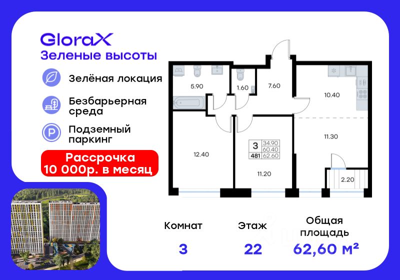 Продается 3-комн. квартира  на 22-м этаже в жилом квартале GloraX Зелёные высоты — проекте в тихой зелёной локации.  Общая площадь квартиры 62,60 кв. м, из которых 34,90 кв. м включая 34,90 кв. м жилого пространства и 10,40 кв. м кухни. Номер квартиры - 481.