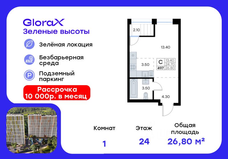 Продается квартира-студия на 24-м этаже в жилом квартале GloraX Зелёные высоты — проекте в тихой зелёной локации. Общая площадь квартиры 26,80 кв. м, из которых 13,40 кв. м включая 13,40 кв. м жилого пространства и 3,50 кв. м кухни. Номер квартиры - 497.
