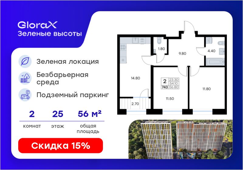 Продается 2-комн. квартира на 25-м этаже в жилом квартале GloraX Зелёные высоты — проекте в тихой зелёной локации. Общая площадь квартиры 56,80 кв. м, из которых 23,30 кв. м включая 23,30 кв. м жилого пространства и 14,80 кв. м кухни. Номер квартиры - 743.