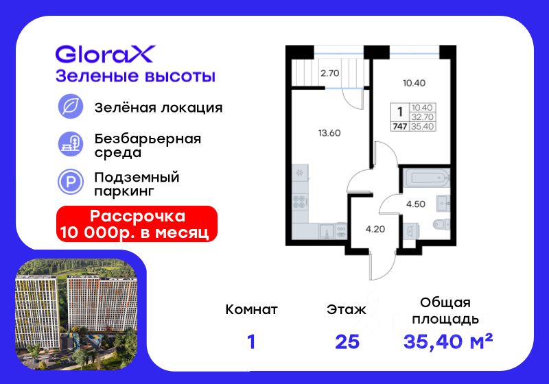 Продается 1-комн. квартира на 25-м этаже в жилом квартале GloraX Зелёные высоты — проекте в тихой зелёной локации. Общая площадь квартиры 35,40 кв. м, из которых 10,40 кв. м включая 10,40 кв. м жилого пространства и 13,60 кв. м кухни. Номер квартиры - 747.